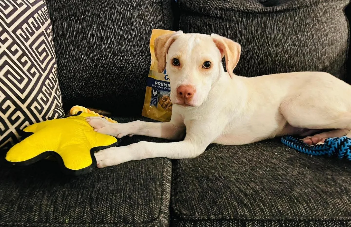 Heās great with other dogs, showing a little interest in the cats but is easily redirected and is phenomenal even around the rambunctious kiddos!